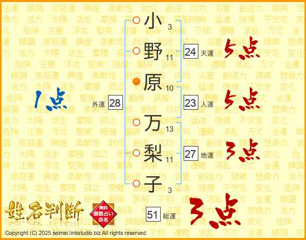小(3画)野(11画)原(10画) 万(13画)梨(11画)子(3画)