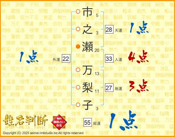 市(5画)之(3画)瀬(20画) 万(13画)梨(11画)子(3画)