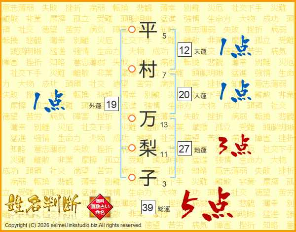 平村万梨子さんの総運は39画の5点!