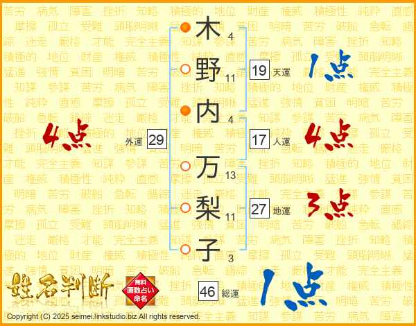 木(4画)野(11画)内(4画) 万(13画)梨(11画)子(3画)