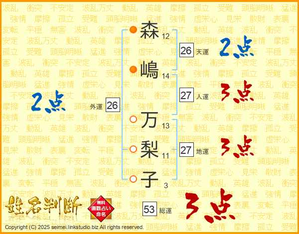 森(12画)嶋(14画) 万(13画)梨(11画)子(3画)