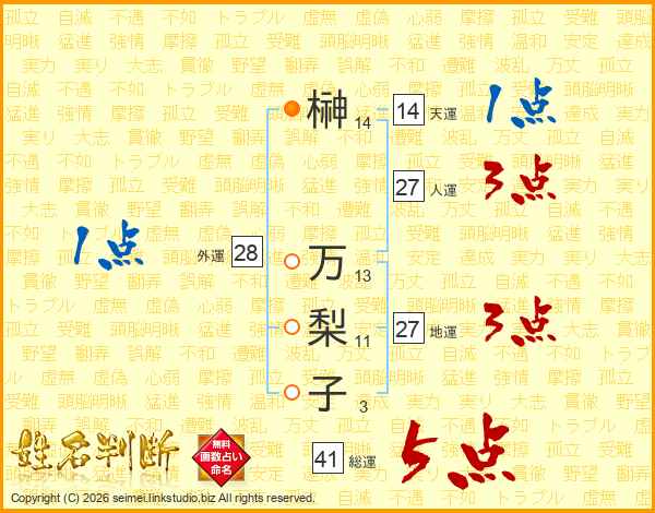 榊(14画) 万(13画)梨(11画)子(3画)