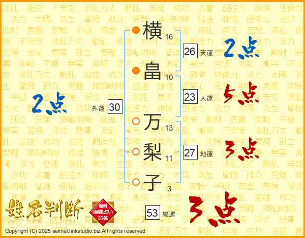 横(16画)畠(10画) 万(13画)梨(11画)子(3画)
