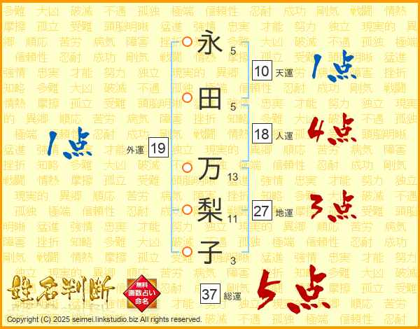 永(5画)田(5画) 万(13画)梨(11画)子(3画)