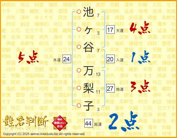 池(7画)ヶ(3画)谷(7画) 万(13画)梨(11画)子(3画)