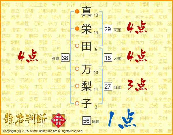 真(10画)栄(14画)田(5画) 万(13画)梨(11画)子(3画)
