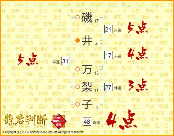 磯(17画)井(4画) 万(13画)梨(11画)子(3画)