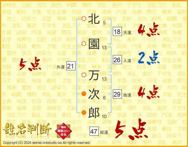 北(5画)園(13画) 万(13画)次(6画)郎(10画)
