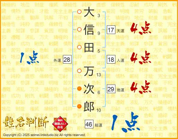 大(3画)信(9画)田(5画) 万(13画)次(6画)郎(10画)