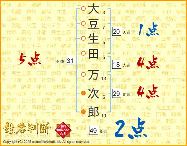 大(3画)豆(7画)生(5画)田(5画) 万(13画)次(6画)郎(10画)