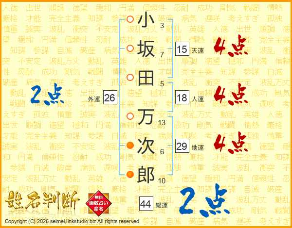小(3画)坂(7画)田(5画) 万(13画)次(6画)郎(10画)