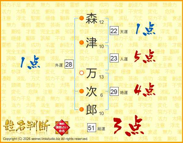 森(12画)津(10画) 万(13画)次(6画)郎(10画)