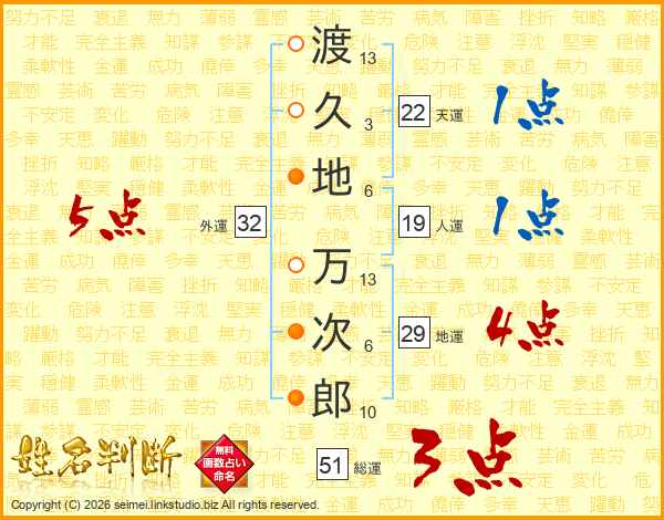渡(13画)久(3画)地(6画) 万(13画)次(6画)郎(10画)