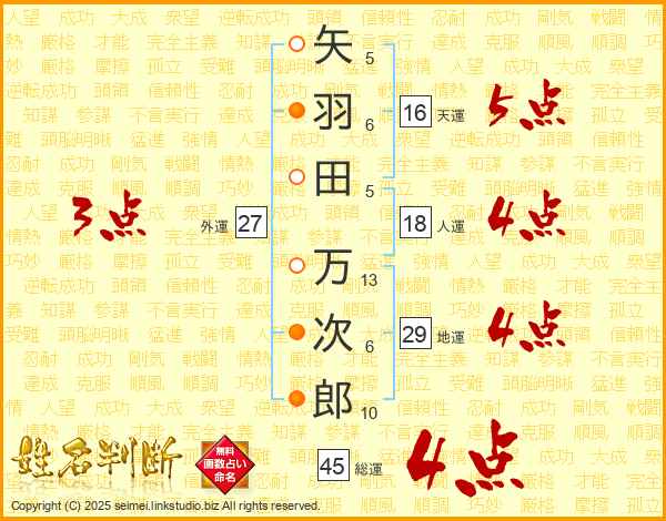 矢(5画)羽(6画)田(5画) 万(13画)次(6画)郎(10画)