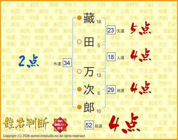 藏(18画)田(5画) 万(13画)次(6画)郎(10画)