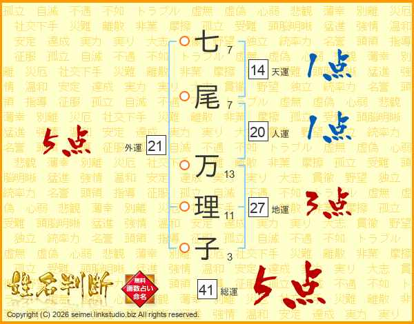 七尾万理子さんの総運は41画の5点!