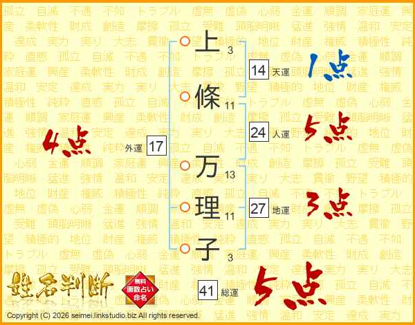 上(3画)條(11画) 万(13画)理(11画)子(3画)