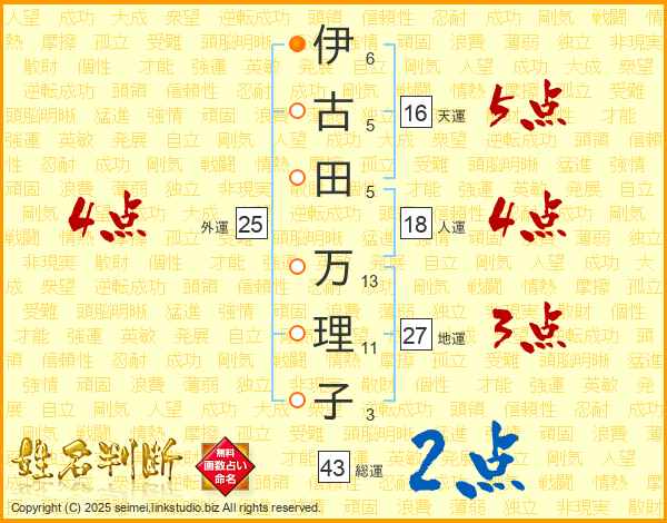 伊(6画)古(5画)田(5画) 万(13画)理(11画)子(3画)