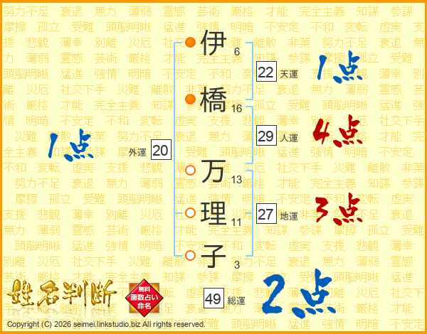 伊(6画)橋(16画) 万(13画)理(11画)子(3画)