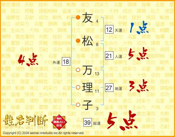 友(4画)松(8画) 万(13画)理(11画)子(3画)