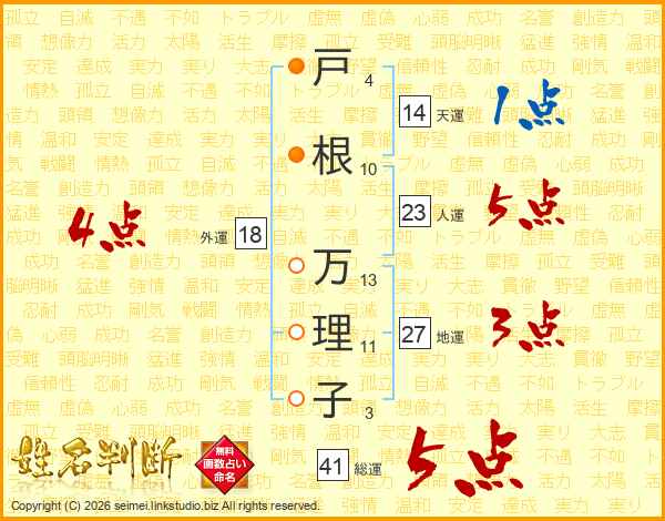 戸(4画)根(10画) 万(13画)理(11画)子(3画)