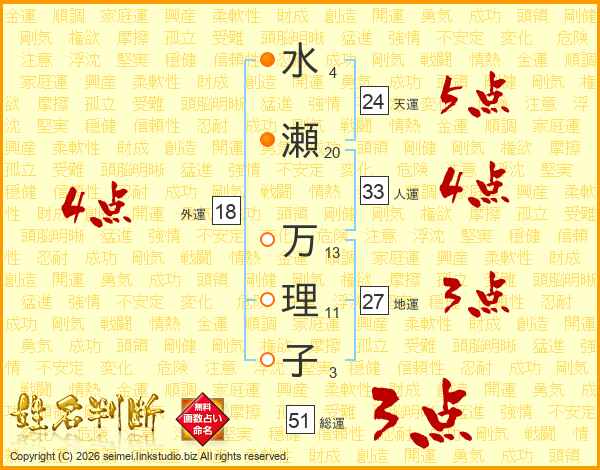 水(4画)瀬(20画) 万(13画)理(11画)子(3画)