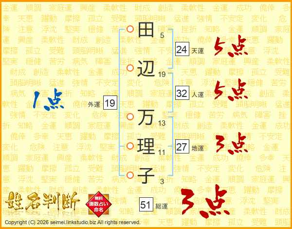 田(5画)辺(19画) 万(13画)理(11画)子(3画)