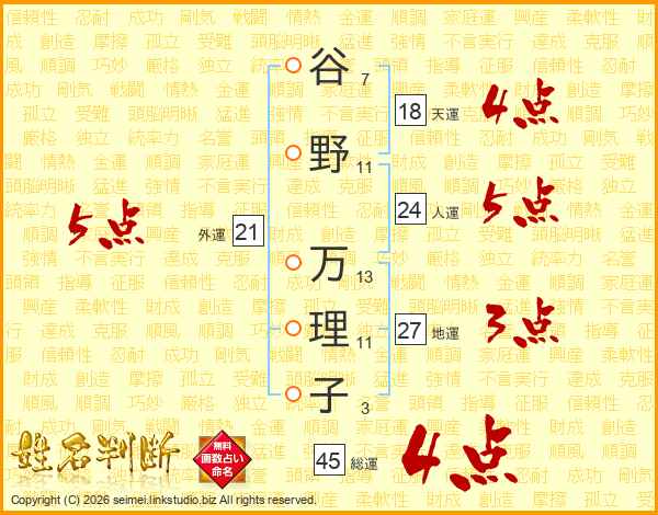 谷(7画)野(11画) 万(13画)理(11画)子(3画)