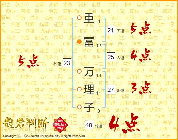 重(9画)冨(12画) 万(13画)理(11画)子(3画)