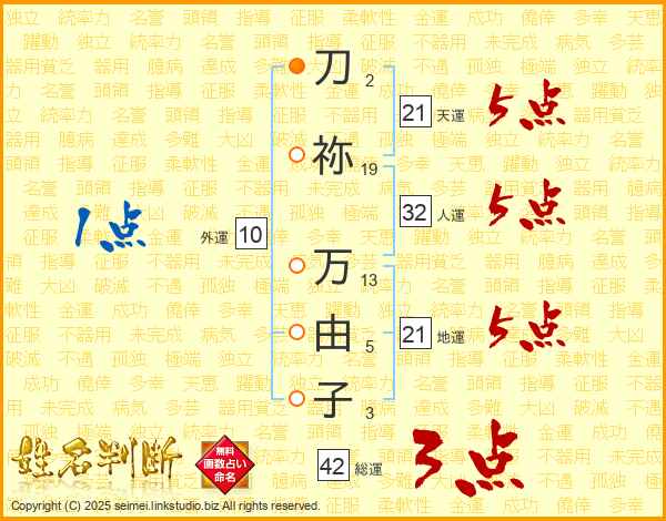 刀祢万由子さんの地運は21画の5点!