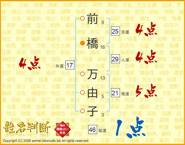 前(9画)橋(16画) 万(13画)由(5画)子(3画)