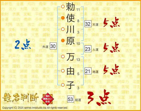 勅(11画)使(8画)川(3画)原(10画) 万(13画)由(5画)子(3画)