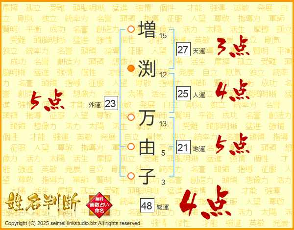 増(15画)渕(12画) 万(13画)由(5画)子(3画)