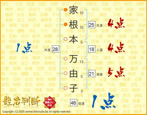 家(10画)根(10画)本(5画) 万(13画)由(5画)子(3画)