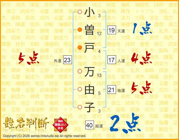 小(3画)曽(12画)戸(4画) 万(13画)由(5画)子(3画)