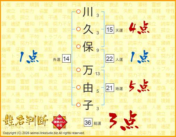 川(3画)久(3画)保(9画) 万(13画)由(5画)子(3画)