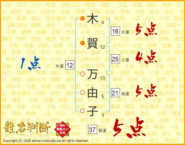 木(4画)賀(12画) 万(13画)由(5画)子(3画)