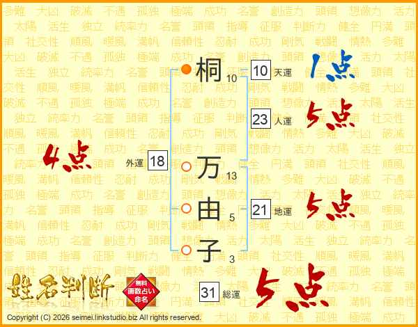 桐(10画) 万(13画)由(5画)子(3画)