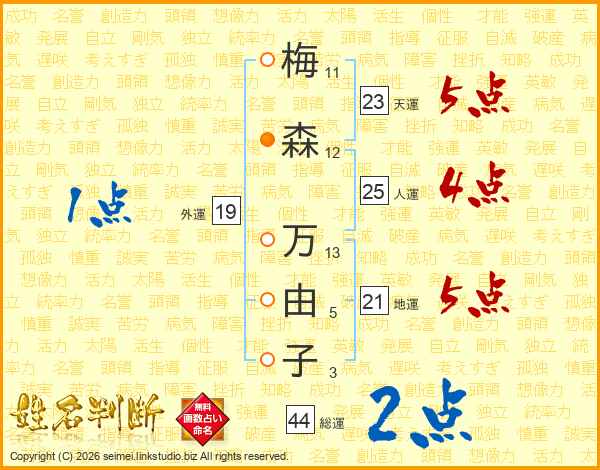 梅(11画)森(12画) 万(13画)由(5画)子(3画)
