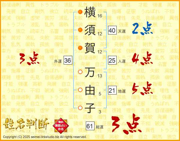 横(16画)須(12画)賀(12画) 万(13画)由(5画)子(3画)