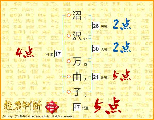 沼(9画)沢(17画) 万(13画)由(5画)子(3画)