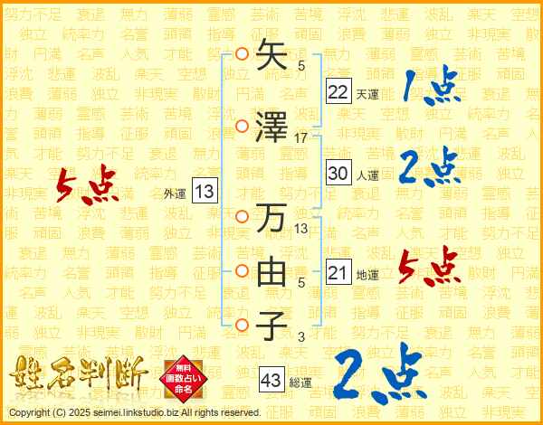 矢澤万由子さんの外運は13画の5点!