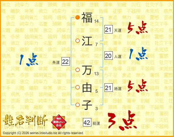 福(14画)江(7画) 万(13画)由(5画)子(3画)