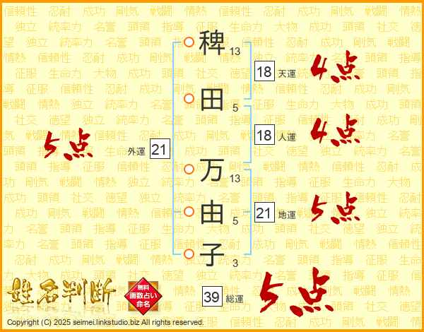稗(13画)田(5画) 万(13画)由(5画)子(3画)