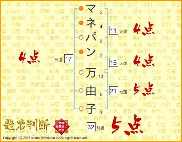 マ(2画)ネ(4画)パ(3画)ン(2画)  万(13画)由(5画)子(3画)