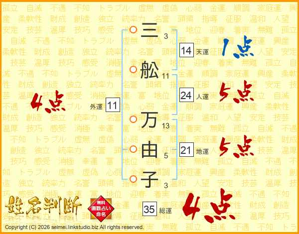三(3画)舩(11画) 万(13画)由(5画)子(3画)