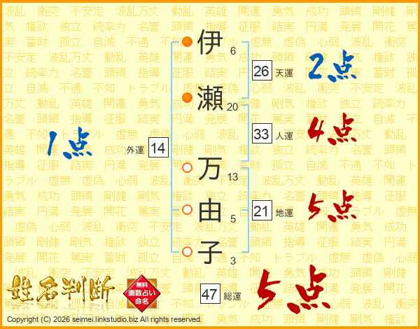 伊(6画)瀬(20画) 万(13画)由(5画)子(3画)