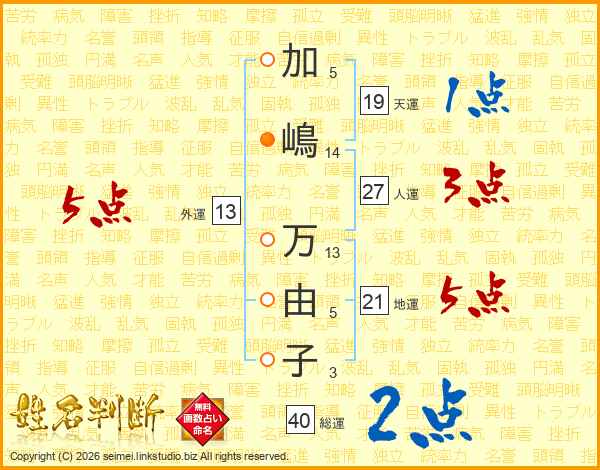 加(5画)嶋(14画) 万(13画)由(5画)子(3画)