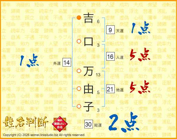 吉(6画)口(3画) 万(13画)由(5画)子(3画)