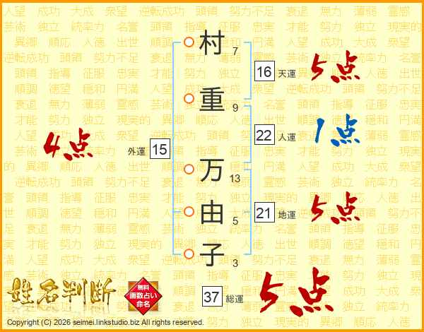 村(7画)重(9画) 万(13画)由(5画)子(3画)